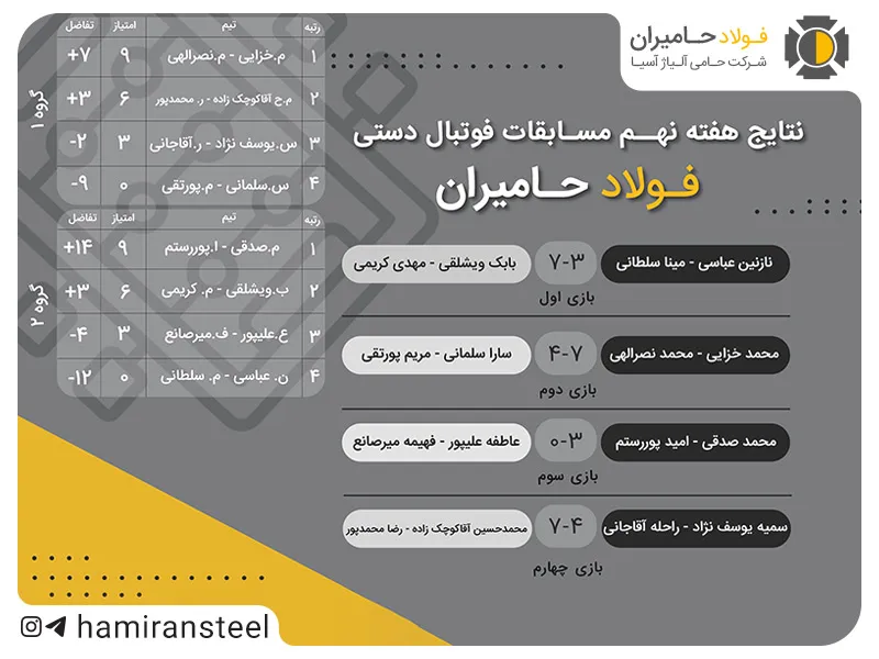 هفته نهم مسابقات فوتبال دستی فولاد حامیران ، با هیجان و رقابت تماشایی گروههای اول و دوم به پایان رسید. این هفته، آخرین بازیهای گروه اول و دوم در این مرحله بود و تیمها با انگیزهای دوچندان برای کسب جایگاه در مرحله بعد به میدان آمدند. بازیکنان با نمایش بازیهایی پرگل و نزدیک، شور و هیجان را به اوج رساندند.