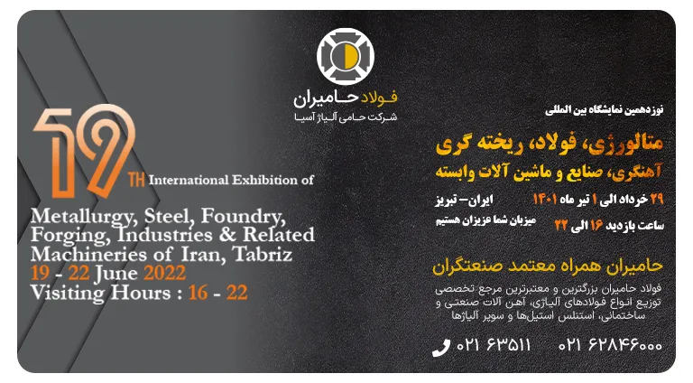 مجموعه فولاد حامیران به عنوان بزرگترین و معتبرترین مرجع تخصصی توزیع انواع فولادهای آلیاژی، آهن آلات صنعتی و ساختمانی، استنلس استیلها و سوپر آلیاژها، در نوزدهمین نمایشگاه بینالمللی متافو تبریز حضور داشته و در سالن پروین اعتصامی میزبان بازدیدکنندگان گرامی است.