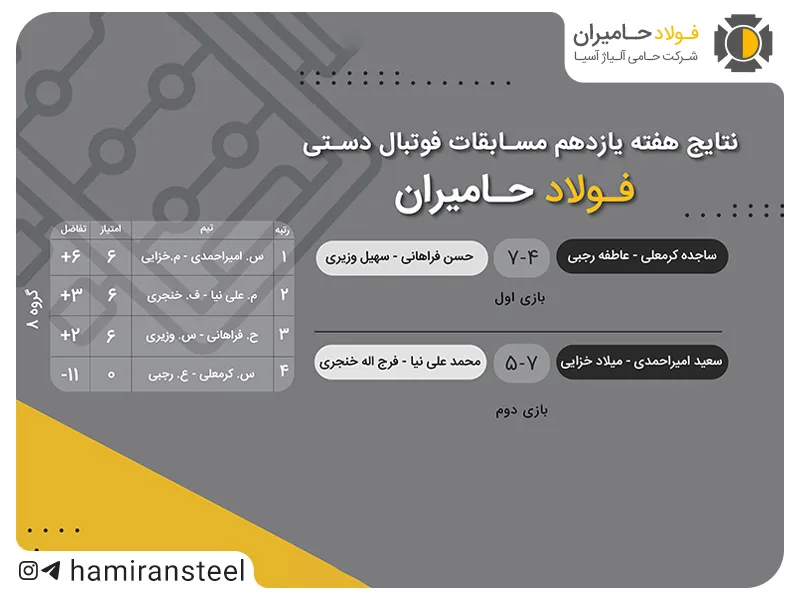 یازدهمین هفته از مسابقات فوتبال دستی با شور و هیجان زیادی برگزار شد و تیمهای گروه هشتم در دو رقابت حساس و تماشایی به مصاف یکدیگر رفتند. این مسابقات که با حضور پرشور بازیکنان و تشویق همکاران همراه بود، لحظات جذاب و رقابتی را به نمایش گذاشت. در پایان این هفته، تیمهای برتر گروه هشتم با تلاش و هماهنگی بالا موفق شدند جایگاههای اول و دوم را از آن خود کرده و به مرحله حذفی راه پیدا کنند.